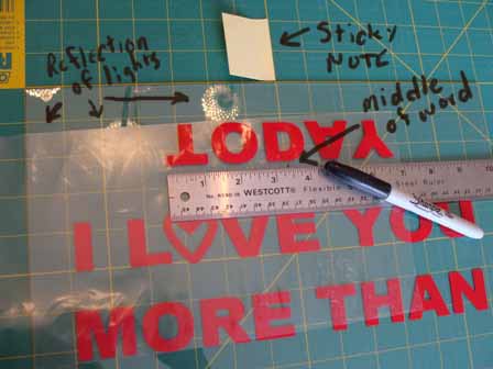4. I lined up the edges of the glass with the grid on the cutting mat and carefully placed the using tacky transfer paper.  Since three of the lines were about the same width, they were pretty easy to get centered.  The word today was a little trickier.   I found the middle of the word, marked the transfer paper with a permanent maker and marked the middle of the glass by placing a sticky note on the mat.