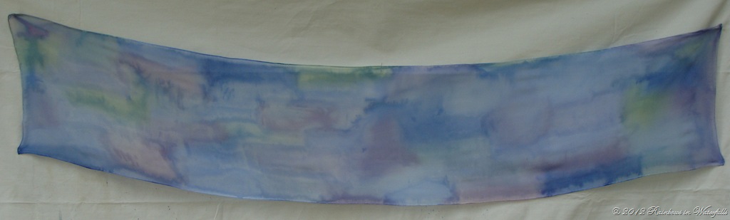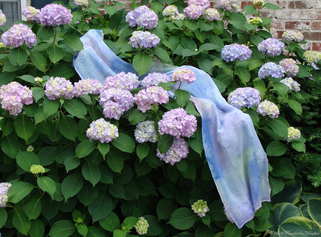 Doesn’t this scarf remind you of the Hydrangeas? There is blue, purple and pink with a little green thrown in for the leaves. This hydrangea scarf is painted on Chiffon silk. It is very light-weight and airy. I love it! New favorite?